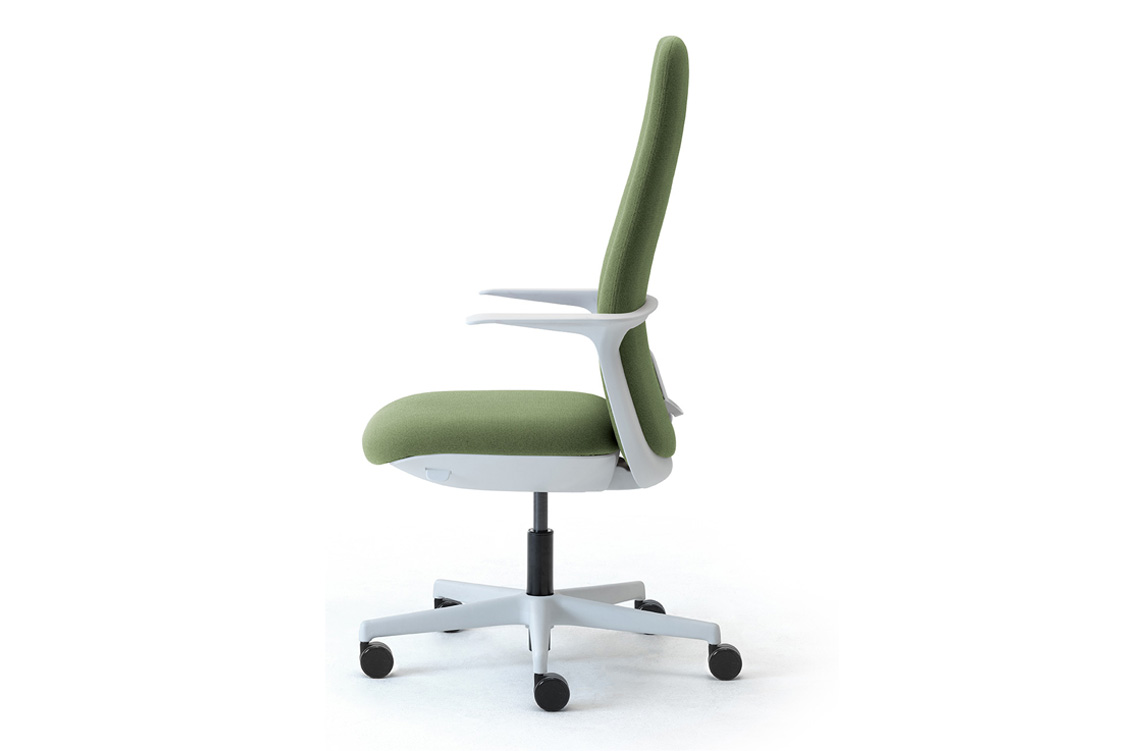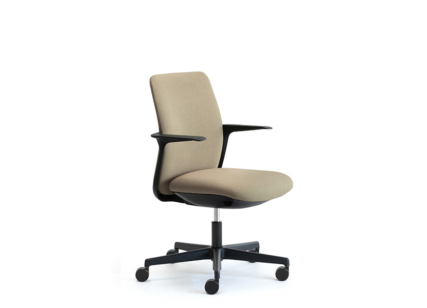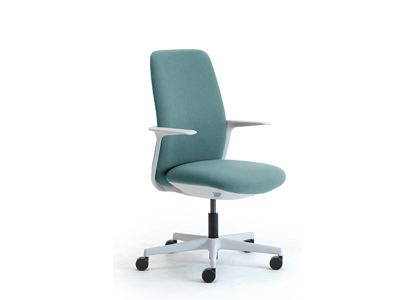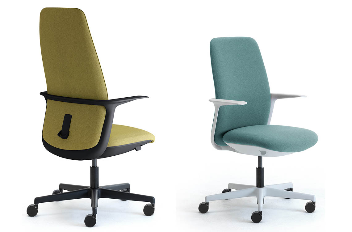 Aura está disponible con partes de plástico blanco o negro que, combinadas con los más de 300 colores para el tejido ignífugo reciclado y reciclable, el cuero ecológico, el cuero y la lana que hacen que el sillón sea adecuado para muebles de oficina y puestos de trabajo ejecutivos con un estilo único y personal.