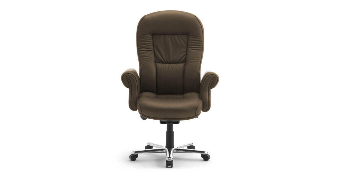 Una silla ejecutiva con reposabrazos acolchados totalmente tapizada en cuero con un diseño majestuoso para el mobiliario de un estudio u oficina; con su diseño clásico, Doge Lux nos permite dar un paso atrás en el tiempo, con una silla presidencial prácticamente perfecta para quienes buscan solidez (el asiento está garantizado para llevar hasta 150 kg) y elegancia al mismo tiempo. Un sillón presidencial de diseño clásico para mobiliario de oficina y estudio: una robusta base de aluminio fundido a presión pulido, mecanismo que permite el movimiento sincronizado del asiento y el respaldo, contribuyen a hacer de Doge Lux la reina de los sillones de cuero para oficinas, despachos ejecutivos y presidenciales con un diseño clásico.