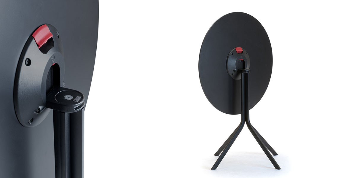 - Mesas altas de tres patas en tubo de acero con un diseño único que se adapta a bares, restaurantes, pizzerías y vinotecas