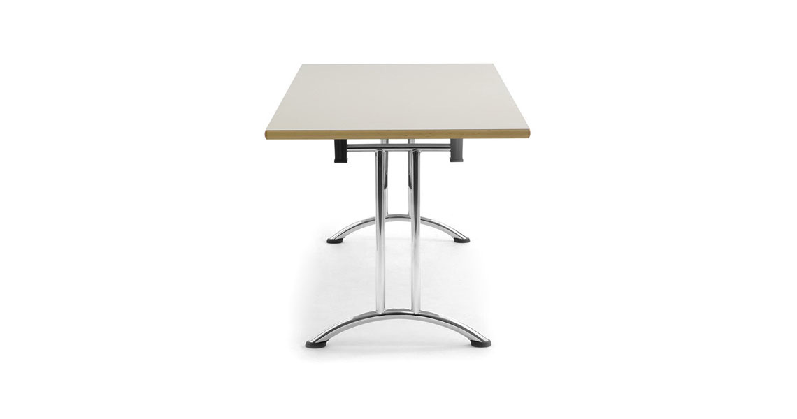 - Mesa con patas macizas plegables en acero cromado para salas de conferencias de dimensiones 1600x800 mm y 1800x800 mm con una altura del suelo desde el suelo de 735 mm
