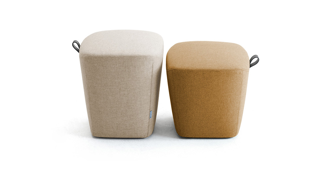 - Puf con asa de transporte con un diseño único y moderno acentuado por una selección de más de 300 colores lisos o bicolores elegidos entre tejido ignífugo reciclado y reciclable, piel sintética, cuero y lana