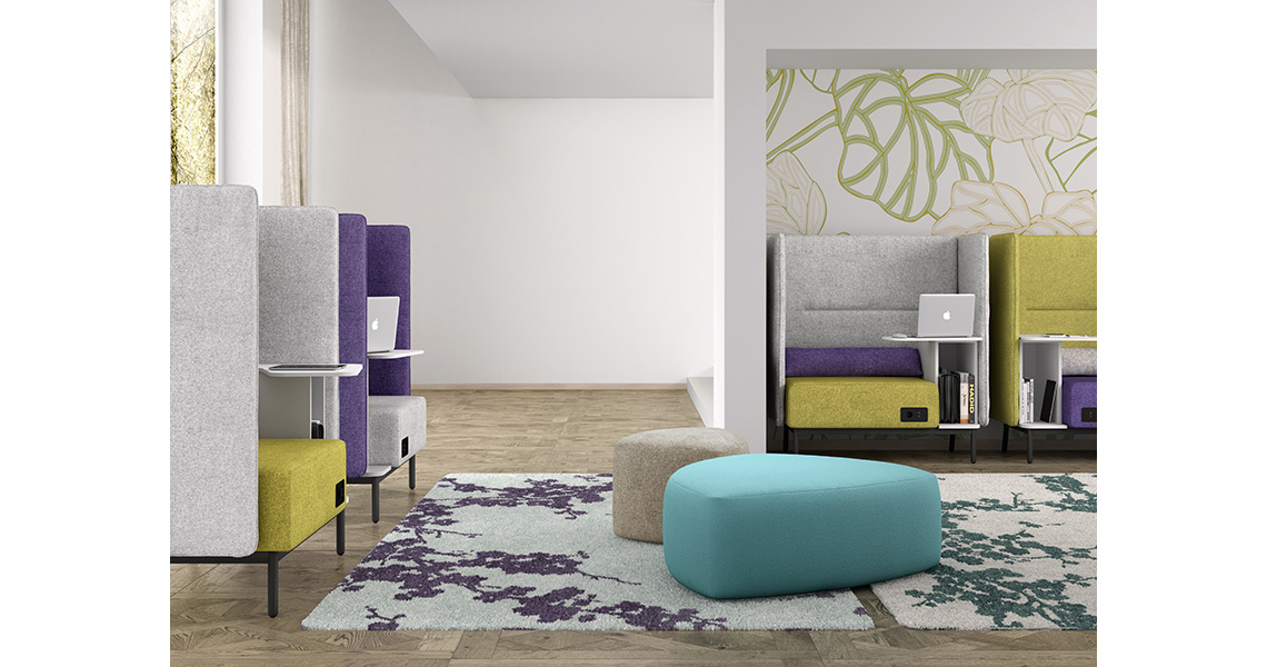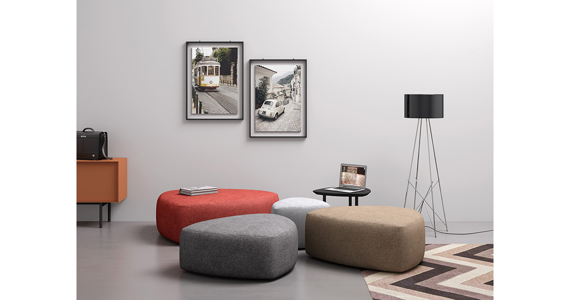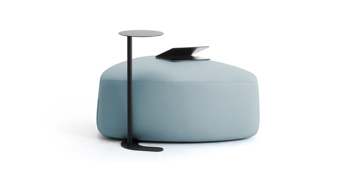 - Pouf cómodo y versátil que puede transformarse en asiento, reposapiés, soporte, mesa o apoyo dentro de áreas destinadas a socializar y compartir como salas de open-space, salones y áreas de trabajo informales.