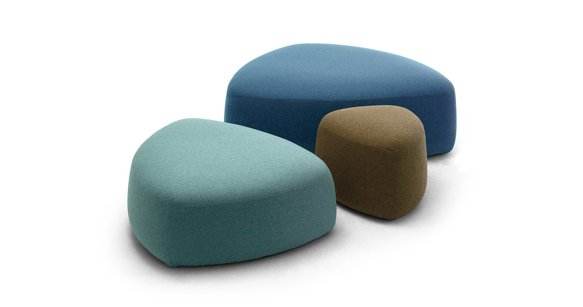 - Pouf con un diseño sobrio y moderno en forma triangular redondeada que recuerda a las piedras y guijarros erosionados por el agua a lo largo del lecho de un arroyo