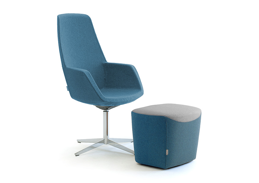 - Un sillón lounge con puf que crea espacios reservados donde invitados, clientes pacientes o simplemente visitantes pueden esperar mientras leen o escuchan música antes de una reunión, consulta o encuentro.