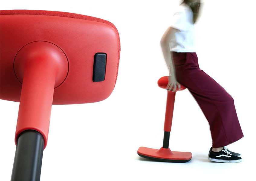 el taburete oscilante Twist tiene un asiento que gira 360° y es ajustable en altura (mín. 530mm y máx. 760mm) mediante un pistón a gas accionado por un doble botón ubicado debajo del asiento; esta funcionalidad alivia la carga de las piernas, permitiendo adoptar siempre la posición ergonómicamente más correcta mientras se trabaja de pie. El cojín del asiento puede estar revestido de tela, ecopiel o cuero, o puede tener un acolchado de poliuretano PU integral que asegura un asiento siempre limpio y resistente a agentes externos muy agresivos como el aceite lubricante, las chispas y la suciedad.