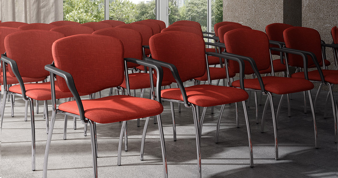 - Sillas de aula y sala de formación apilables hasta 15 piezas que pueden tener reposabrazos; estos últimos son muy útiles en el caso de reuniones de larga duración porque favorecen el descanso de los brazos