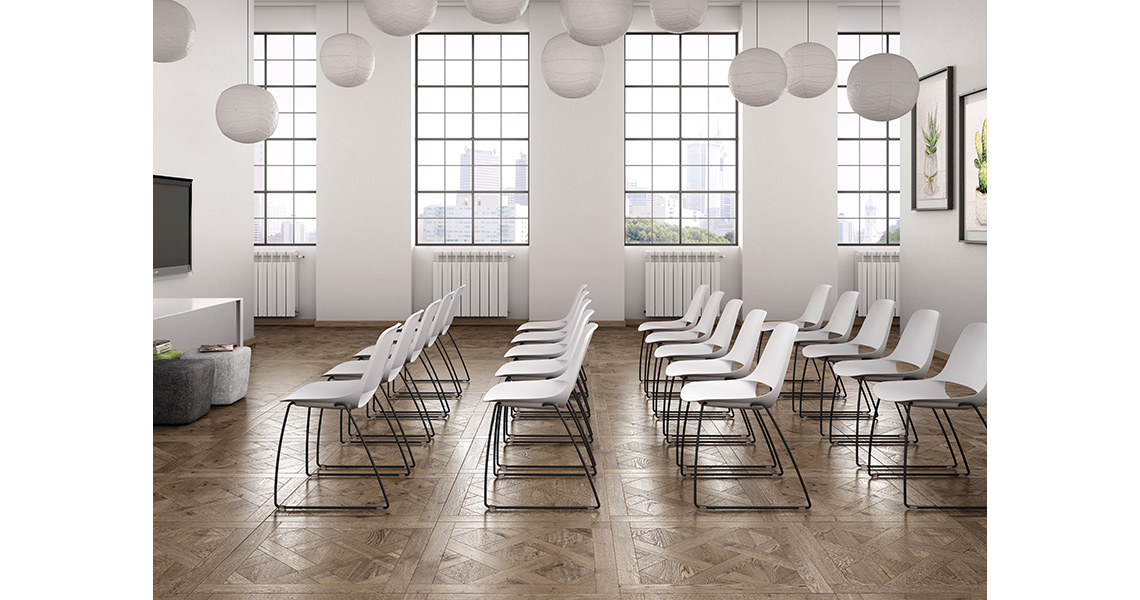 - Sillas para conferencias, congresos y seminarios con monocasco de plástico que pesa solo 5,5 kg y se puede apilar fácilmente hasta 4 piezas