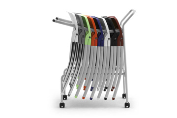 Opcionalmente, es disponible un carro para sillas pintado de color gris aluminio para transportar hasta 10 sillas plegadas. Arcade es una silla resellable disponible en una gran variedad de acabados y colores para satisfacer todas las necesidades de mobiliario colectivo multifuncional: las patas de metal plegables son de aluminio o cromadas.