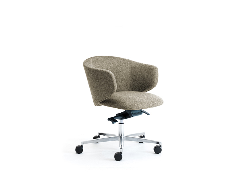 - La familia de sillones Alisè cuenta con mecanismo sincronizado, elevación a gas, ruedas giratorias, base de aluminio de 5 radios, estructura metálica envuelta en tapicería de goma de poliuretano en piel, ecopiel, lana o tejido ignífugo reciclado, con más de 300 tonos de color.